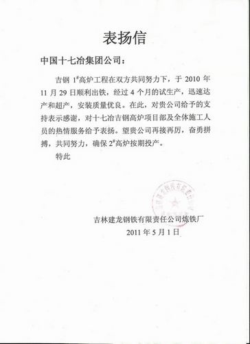 日前,吉林建龙钢铁有限责任公司炼铁厂致信我公司,表扬十七冶承建的吉钢一号高炉优良的安装质量。
