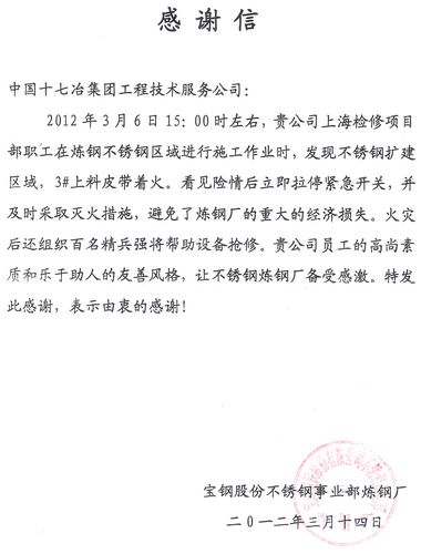宝钢不锈钢事业部致信感谢工程技术服务公司