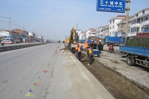 由于工程的特殊性,项目部采用了半幅通车半幅封闭施工的施工方法。为确保施工安全和道路畅通两不误,项目部对道路南半幅封闭施工,对北半幅辅导、主车道隔离带树木及钢护栏等设施全部拆除,做好混凝土硬化和安全警示标志标牌的设立。