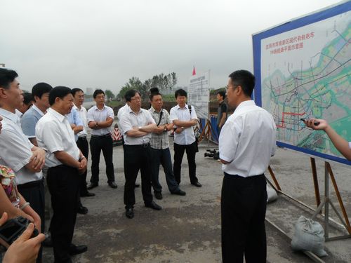 712,唐山市市委常委、常务副市长王久宗等领导一行27人莅临中国十七冶集团路桥工程技术公司承建的沈阳有轨电车1号线施工现场参观指导。沈阳市浑南新区现代有轨电车指挥部闵祥虎部长向各位领导介绍了工程规划、设计及具体施工情况。