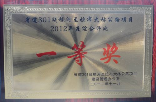 内蒙根拉公路项目部荣获业主2012年度综合评比一等奖