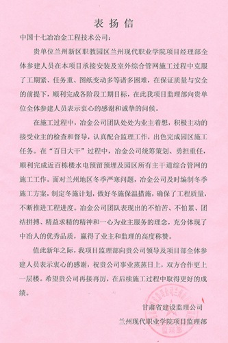 1230日,由中国十七冶集团冶金工程技术公司承建的兰州现代职业学院项目部收到了监理单位发来的表扬信,对该项目顺利完成各阶段的工期目标提出了表扬。