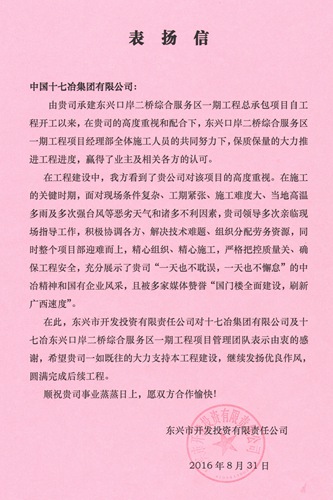 8月31日,东兴市开发投资有限责任公司向中国十七冶集团致表扬信,对十七冶东兴国门工程项目管理团队表示感谢,盛赞十七冶在国门工程建设中高效务实的作风,创造了“国门速度”。