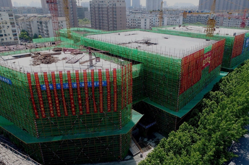 合肥东环中心项目位于合肥市长江东路与东一环交叉口东北角,总建筑面积约24万平方米,包括1162.8米高的超高层办公楼、4栋高层住宅、5栋商业裙房及整体三层地下室。商业楼紧邻东一环路,地上5层,地下整体三层,总建筑面积40000平方米,主体施工约6个月时间。目前,整个东环中心项目已施工完成面积约80000平方米,4栋住宅楼已全面进入标准层施工阶段,预计10月份按期结构封顶。