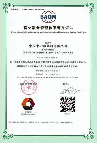 6月6日,中国十七冶集团收到国家工信部颁发的“两化融合管理体系”再评定证书,这是公司获得该体系评定证书之后的再次通过评定。