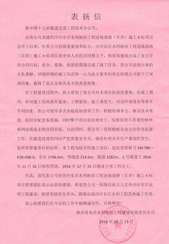 5月23日,陕西省东庄水利枢纽工程建设有限责任公司向中国十七冶集团有限公司交通工程技术分公司致信,表扬陕西泾河东庄水利枢纽进场道路工程项目部保质保量完成业主方的合同目标,安全、高效、优质的圆满完成施工任务。