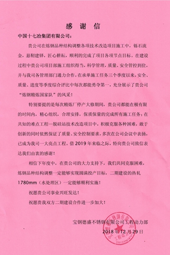 宝钢德盛不锈钢有限公司向十七冶致感谢信