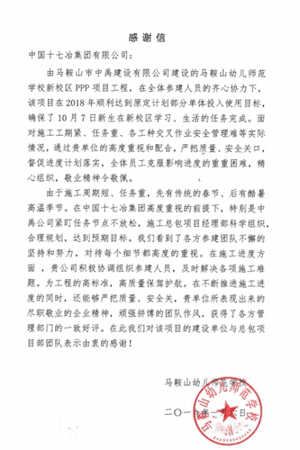 1月7日上午,马鞍山幼儿师范学校向中国十七冶集团有限公司发来感谢信,对中冶置业(安徽)公司在工期紧任务重的情况下,高标准、严要求精心组织施工,顺利完成马鞍山幼儿师范学校工程原定计划部分单体的建设任务表示衷心感谢。