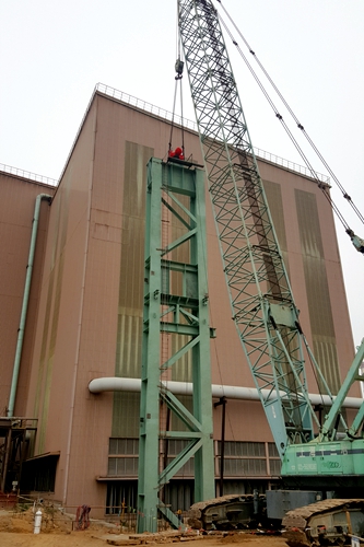 炼钢南扩主厂房为单层排架与多层框架组成的多跨全钢结构厂房,延长跨主厂房为南北走向,总长度278米,厂房顶部标高为58.6米,行列线为3~5线。自西向东分别是25米转炉跨、27米钢水精炼跨、25米钢水接受跨组成,其中转炉跨为多层框架结构,跨内设有多层钢平台。本次吊装的钢柱重量约为76.3吨,长30.68米。项目部经过前期紧张的准备工作,克服施工场地小、连续阴雨天气、大件运输困难等不利因素,精心组织、统筹安排,充分做好安装前的准备工作,比预定开工日期提前了4天。