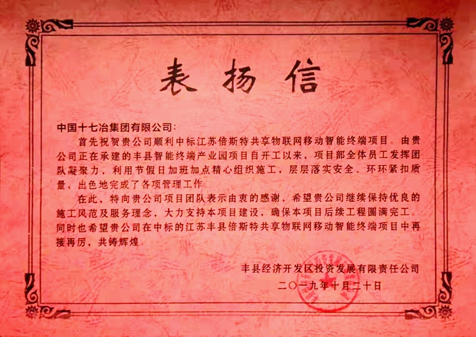 10月22日,丰县经济开发区发来表扬信,对中国十七冶集团房屋工程技术分公司承建的丰县智能终端产业园项目部给予了高度赞扬。