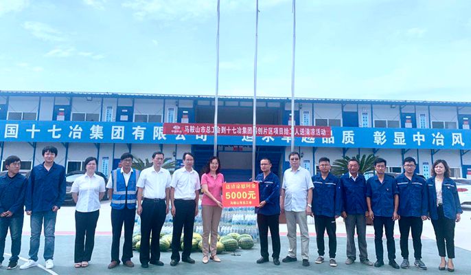 “送清凉”是中国十七冶集团工会多年来持续深入开展的一项传统活动,关心关爱烈日下的最美坚守者,送去暑热中的一份清凉和关怀,得到了广大干部职工和社会各界的热烈好评。中国十七冶集团工会始终坚持把职工身体健康和生命安全放在首位。6月22日,公司董事长、党委书记喻世功, 总经理、党委副书记刘安义在宝钢德盛新炼钢(一步)工程慰问了高温下仍然坚守岗位的一线施工人员并为当地农民工代表送上了藿香正气水、风油精等防暑降温药品以及茶叶、毛巾、洗发水、盐汽水等生活物品,同时叮嘱大家要注意休息,合理调整夏季高温作业时间,减少露天高温时段作业。指出要继续加强职业卫生工作,落实好防暑降温措施,确保广大一线职工清凉、健康、安全度夏。公司领导班子其他成员、工会主席分别前往博望管廊片区项目、遵义广厦·未来城城市综合体项目、西安地下综合管廊项目、G206蕲县北至怀远界段改造项目、滁州市奥体中心项目、马鞍山经开区片区项目、兰州奥体中心项目、兰州盐什公路项目等17个项目点开展送清凉工作。