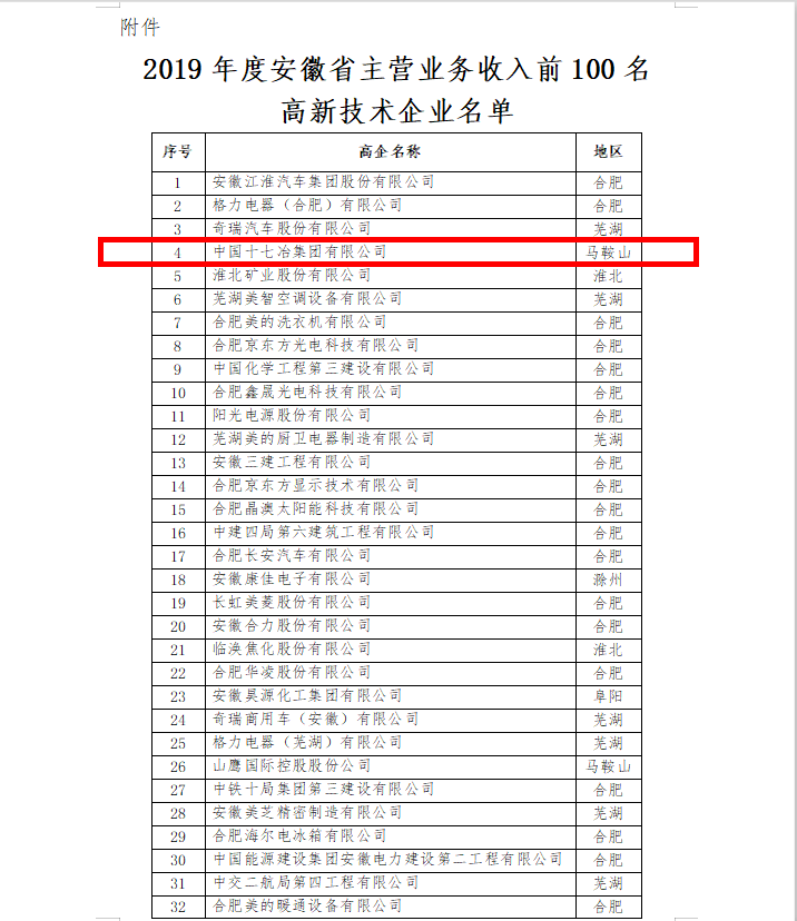 10月16日,从安徽省科技厅官网获悉,中国十七冶集团有限公司入围2019年度安徽省主营业务收入前100名高新技术企业名单,位列排行榜第四名。
