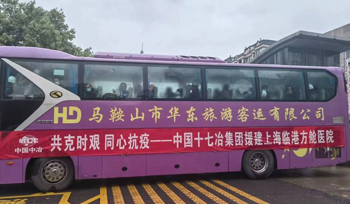 4月13日下午5点,随着大巴车的缓缓启动,中国十七冶集团迅速集结的首批100余人建设队伍出发,紧急驰援上海临港方舱医院建设。