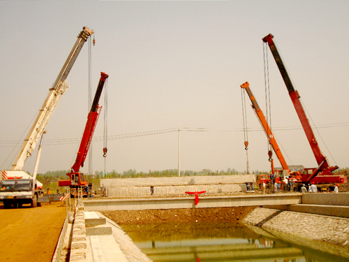 规划一号桥48片后张法预应力空心板梁,工程量大,施工环节较复杂。为了能尽快完成板梁安装,项目部根据现场实地情况编制合理可行的施工方案,方案采用235t汽车吊起梁、移梁,拖炮车配合运梁,上桥后245t汽车吊将板梁安装就位,预计在两天内完成规划一号桥的板梁安装。