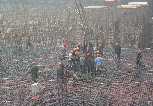 连日来,在一万多平方米的大基坑内,参战员工们冒着寒风、雨雪零下低温天气,日夜连班作业,挖桩、挖土、支模、绑钢筋、浇灌砼等多工种同时作业,各项工作紧张进行而又井然有序,仅两天完成基坑南侧裙楼A-J轴负二层满堂红架150吨钢管搭设任务;一天完成J-N轴夹层楼板119吨钢筋绑扎;一天浇注完板柱砼800立方。这种超越式的工程进展,为项目部春节前实现裙楼出地面的节点目标奠定了基础。