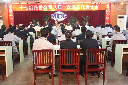 26上午,路桥公司在雄壮的国歌声中升起了五星红旗、中冶旗和十七冶司旗。伴随着《中冶辉煌》的歌声,路桥公司隆重召开了八届一次职工代表大会。路桥公司领导及正式和列席代表共44名同志参加了大会。
