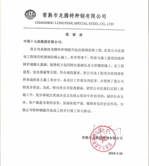经业主工程监理现场的专项检查,对我公司在工程施工进度,安全质量等方面给予了高度赞扬。特别称赞了承担此项工程的项目经理部,他们克服困难,发扬十七冶人特别能吃苦,不怕疲劳,顽强拼搏的精神,加班加点,创造性地开展工作,在抢工期保节点上,主动出击往前赶,从而全面推动了工程的各项工作进度。为此,龙腾特种钢有限公司总经理徐利专门签发致谢函,感谢龙腾特种钢项目经理部。