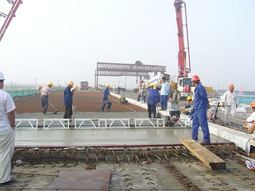 桥面铺装是特大桥最后工序中的关键节点。业主中冶交通将此节点作为考核节点(091231日完成)。项目部领导班子极为重视,多次召开专题会议对施工技术、工艺流程等进行讨论和布置,对方案实施做了大量外部协调工作。在进行摊铺作业时,监理和中冶交通有关人员亲临现场指导工作,并得到了他们认可和好评。十七冶路桥公司经理,党委书记陈阳、常务副经理程大友,亲自参与特大桥桥面摊铺混凝土施工的全过程,并鼓励天津项目部全体员工一定以科学的方法和周密计划,发扬路桥人能征善战的光荣传统,保质、保量、高效安全的完成业主所要求的工期节点。