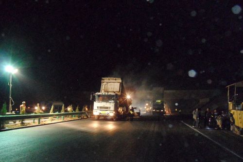 为确保湖北大广南高速公路5月份建成通车目标,日前,路桥工程技术公司湖北黄石项目部奋力拼搏,挑灯夜战铺设沥青路面,全力抢工期。