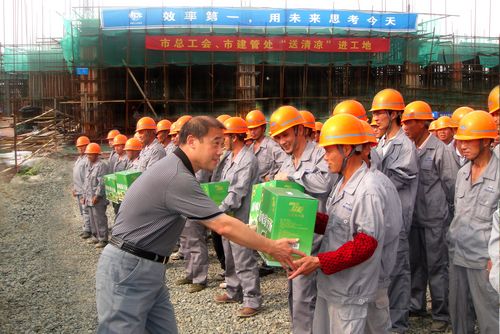 810下午,市总工会主席张宏展、市建管处党总支书记赵正华等领导亲临金安小区安置房施工现场,慰问奋战在施工一线的员工们,并送去了绿豆汤等防暑降温食品。