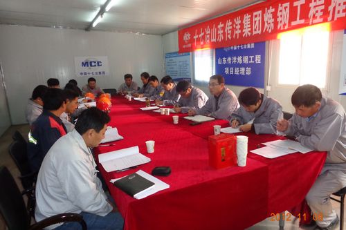 118下午,冶金工程技术公司承建的山东传洋集团炼钢工程项目部召开推进会,明确“大干80天,全面完成山东传洋炼钢工程机电管安装工作,确保2013年元月底炼钢工程设备单体试车”的目标。冶金公司党委书记周美初、副经理周金龙、项目监管部副部长朱宏刚及项目部负责人参加了会议。