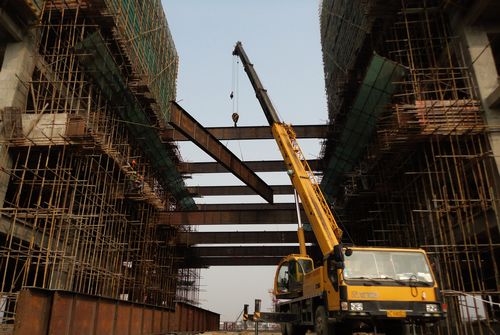 城市之门工程包括两栋二十层的高层建筑,在两栋主楼之间三层至五层、十七至二十层处以过街楼相连接。每座过街楼需安装20榀、跨度为24、每榀重量约5吨的H型钢梁。施工中,项目部科学组织,严格按照规范操作,确保施工安全和质量,用时三天时间,顺利完成三至五层处首批12榀钢梁吊装。