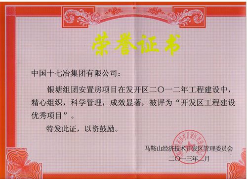 218,在马鞍山市经济技术开发区召开的2013年综合工作会议上,房屋工程技术公司银塘组团安置房项目部被马鞍山经济技术开发区管理委员会授予“开发区工程建设优秀项目” 荣誉称号,项目经理朱发生同志获“工程建设管理先进个人”殊荣。