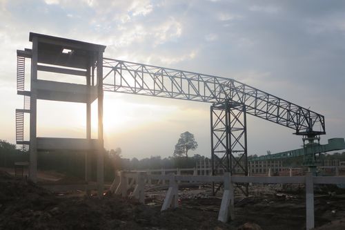 该桁架横跨石灰石堆场外转运站和石灰石堆场中心立柱,总跨度50.75m,呈L型,钢桁架骨架总重约40t。吊装期间,印尼南加里曼省烈日炎炎,室外气温高达40,为保证吊装连续性,项目员工加班加点,350t汽车吊协同吊装,历时10个小时,顺利完成了罗锅桁架吊装,确保了节点按时完成,受到了业主、监理等单位的一致好评。