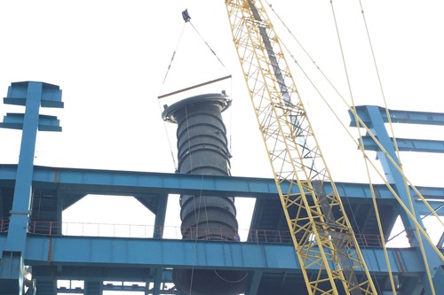 11月10日下午,由中国十七冶集团冶金工程技术公司承建山钢日照钢铁精品基地炼钢主车间工程1#转炉汽化烟道斜直段顺利吊装就位。