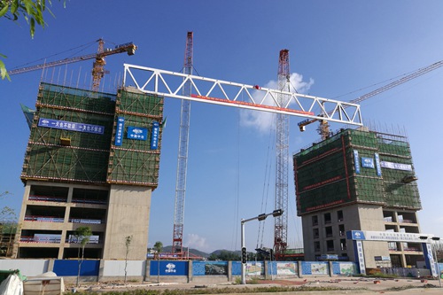 1028日上午,由中国十七冶集团承建的东兴国门项目第一榀大跨度钢桁架缓缓就位。