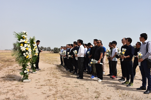 在祭扫现场,各中资企业协会成员代表列队为逝去的同胞默哀。科威特中资企业协会会长杨春森致辞,缅怀了自上世纪中科建交以来赴科工作中牺牲、去世的华人的事迹和做出的贡献,并表示广大的在科中资企业职工将传承海外华人开拓奋斗的精神,继续努力前行,争当祖国“一带一路”倡议实施中的排头兵。随后,大家向华人陵园敬献花圈。