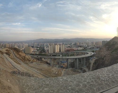 兰州中线连接线项目为兰州市重点建设项目,项目起于园区金茂街沿臊狐沟东测南下,在K1+900处采用螺旋型展线克服高差旋转1圈半下穿北环路后止于长新北路,与北环路设匝道互通。道路全长4.2千米,设1.336千米特大桥1座,最高桥墩42.5米,最大跨度40米。