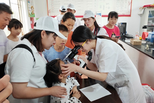 活动现场,团市委协同十七冶医院共同为留守儿童代表发放了书包、铅笔、图书等学习用品。十七冶医院的医护团队在活动现场全程为所有的儿童和空巢老人进行了免费义诊。现场检查发现多名老人存在高血糖的情况,数名孩子存在不同程度的结膜炎。医护人员向在场的老人和志愿者进行了简单的宣教,发放了疾病预防彩页,并留下了科室的联系电话,欢迎乡亲们随时咨询。