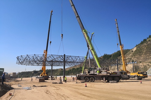 8月9日上午,中国十七冶集团公路工程技术分公司承建的G30连霍高速公路兰州东(定远匝道)收费站和兰州北(忠和匝道)收费站建设项目北收费站收费大棚首片钢结构网架开始安装及改道基层水稳开始摊铺。