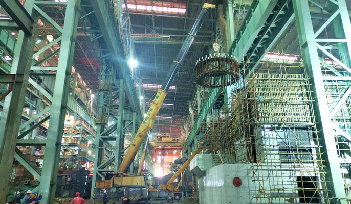 宝钢湛江连铸工程是在原厂房2#和4#连铸机之间新增3#1650mm板坯连铸机及配套的公辅设施,属于在线技改工程,施工与生产深度交叉,施工难度大。此次安装就位的大包回转台锚固件直径5.6米、总重量22吨。因为在生产区域施工,根据现场实际情况,经多次协调确认,最终将吊车站位确定在钢水接受跨,选取160t汽车吊进行吊装作业,首个设备部件顺利安装就位。