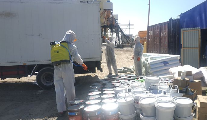 根据乌国疫情发布信息,由哈萨克斯坦进入乌兹别克斯坦的大货车司机出现多例确诊,而大货车是必须进入施工现场的,如何把大货车司机可能带入疫情进现场的风险降到最低是一个防控关键点。为此,项目部重新作出部署,在进入现场的主大门入口,原来作为施工人员进入现场的实名制通道,也是入场车辆的唯一入口。为了阻断外来大货车司机与施工人员接触的可能性,项目部封锁了大门处的实名制通道,从生活区后方重新设置一处人员通道,现场大门处仅供车辆通行使用,实现人车分流。入场的大货车需经过两道关,第一道是在厂区外接受初步的消毒和测温检查,第二道即是在项目部入场大门前接受全面的消杀处理和测温复查,并对大货车贴条封闭,严禁司机在场区内下车走动与场内员工接触。期间对大货车进行消杀和检查的人员必须提前穿戴好防护服、护目镜、口罩等防护用品,并于事后进行彻底的消毒处理。