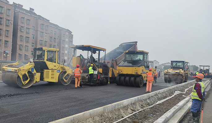 鸭绿江路全长约5186.116米,呈东西走向,设计时速40公里,道路等级为城市次干路,红线宽度28米,双向四车道,计划工期24个月。本次沥青摊铺采用三机联合成梯队摊铺。受疫情和气影响,项目工期被大幅缩短,为确保工程建设按期推进,项目部顶住压力,超前谋划,科学合理制定实施方案,不断细化任务分工,层层落实主体责任 ,合理调配人员和机械设备。认真落实安全、技术交底,强化过程管控,规范工艺流程,严格控制沥青混合料的拌合、运输、摊铺、碾压、检测等各个环节,有效的保证了沥青摊铺质量可控、工期可抓。