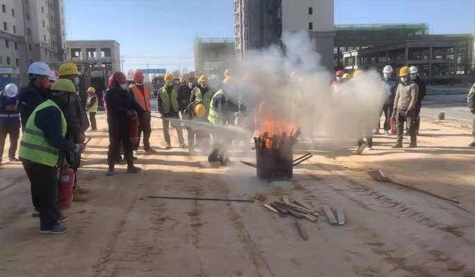 此次演练包含消防知识讲解、火灾应急演练、消防器材实操、应急救援教学等环节。项目部安全部负责人详细讲解了火灾现场的人员救援重要设施设备和重要财产的抢救扑灭火灾的操作方式等知识内容,项目专职安全员向广大工友讲解及展示干粉灭火器的灭火原理及操作方法。演练过程中,各演练队伍有序行动,反应迅速、配合有力、应急处置专业,协调联动有序,项目部安全管理人员对现场存在的问题及时做出了指导和调整,让参演人员真正的掌握消防救援的步骤和细节。