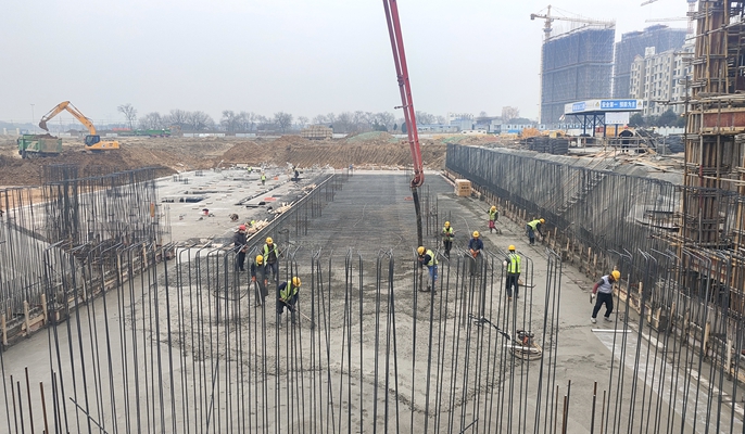 为确保地库筏板基础顺利浇筑,项目团队结合现场实际,优化施工方案,科学配置资源,提前对现场作业人员进行针对性技术质量、安全交底。本次浇筑采用63米泵进行浇筑,项目部全程跟踪混凝土浇筑情况,协调商砼供应站安排专人紧密跟踪,对商砼运输车辆进行实时调度,确保浇筑过程商砼供应不间断,保证筏板浇筑质量和安全。