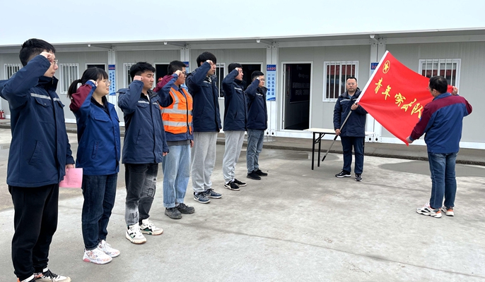 4月6日,中国十七冶房屋分公司巢马城际铁路当涂县江心洲安置房项目举行“青年突击队”授旗仪式,项目党支部代表为突击队授旗,7名团员青年参加授旗仪式并宣誓。