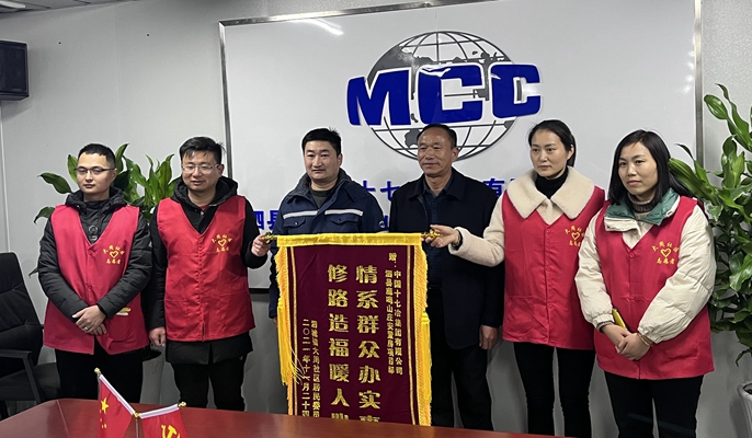 十七冶南京分公司承建的鹿鸣山庄安置房项目位于安徽省宿州市泗县泗城镇花园路北,项目临近村庄主出入口,道路及路边涵沟因常年失修破损严重,经项目部及大周社区共同协商研究,决定为村民修缮道路及涵沟,以解地方村民出行困难。项目部组织人员将原来坑洼不平、弯曲狭窄、泥渍沉积的水泥路进行重新破除浇筑,大大提升了周边村民的出行条件,此外还帮村民修建了近200米排污沟渠,村民们一致称赞项目部的暖心举措,并送来了锦旗。