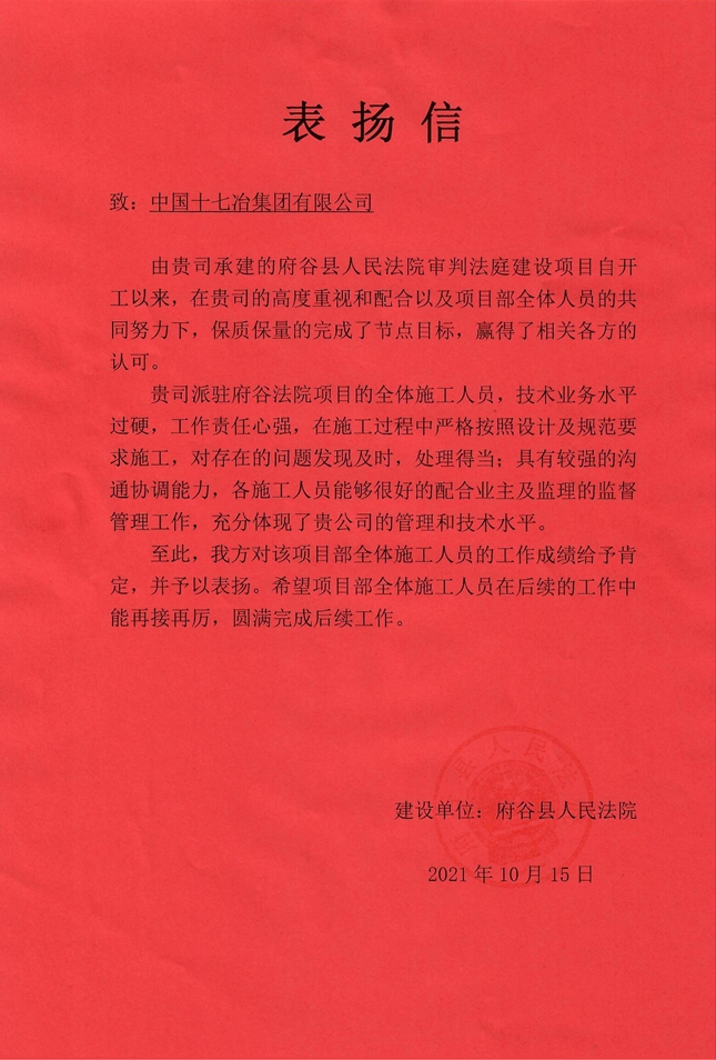 12月22日,中国十七冶集团收到来自业主方代表送来的“优秀总承包单位”“优秀项目部”两面锦旗及一封表扬信。该信函对建筑工程技术分公司府谷法院项目管理人员的技术业务水平和沟通协调能力给予高度赞扬,对项目部保质保量完成节点目标提出表扬。