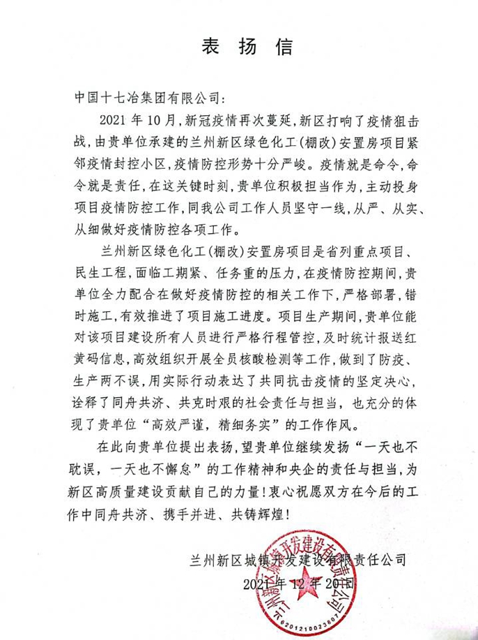 近日,兰州新区城镇开发建设责任有限公司向中国十七冶集团有限公司送来表扬信,对甘肃分公司承建的兰州新区绿色化工(棚改)安置房项目在疫情防控工作、施工进度及现场文明施工等方面工作成绩提出表扬。